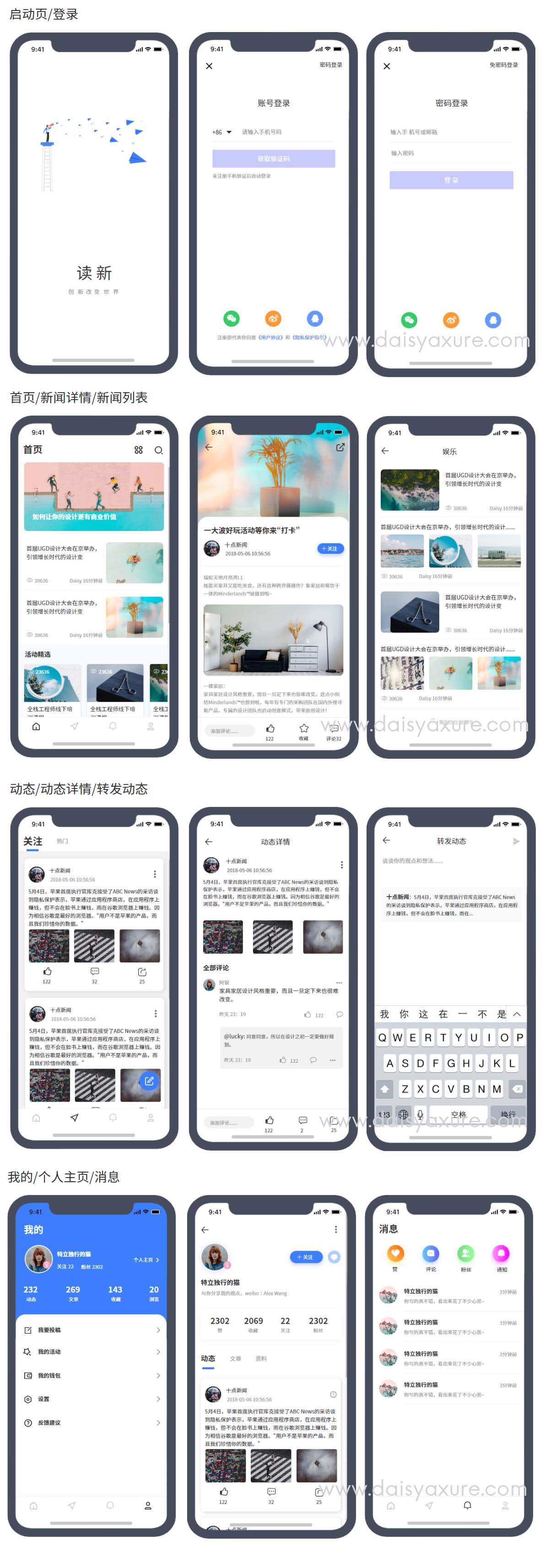 本作品是一款新闻资讯APP,根据用户感兴趣领域以及浏览记录为用户精准推荐新闻资讯,主要有文章列表、文章详情、打赏、动态、消息等功能,所有元件均可复用,既可作为移动端原型设计模板,也可作为同行业实战原型功能逻辑参考。